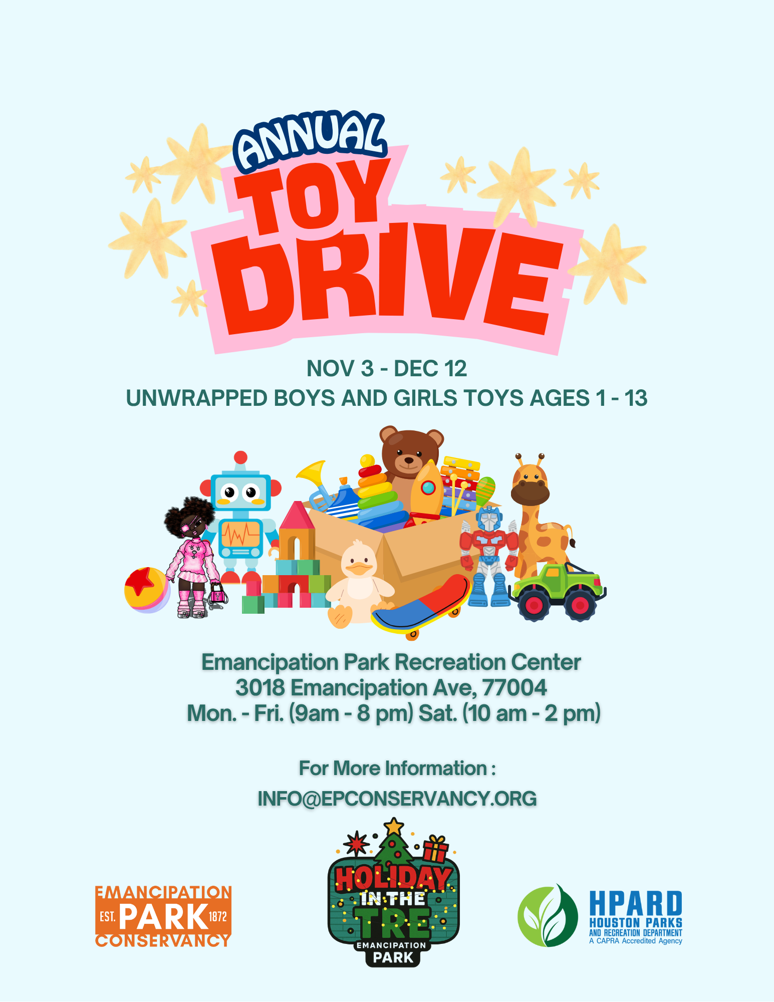Annual Toy Drive + Add to Google Calendar + iCal / Outlook export 00 days 00 hours 00 minutes 00 seconds Date Nov 03 2025 - Dec 12 2025 Ongoing... Time All Day Location Emancipation Park 3018 Emancipation Avenue Houston, TX 77004 Category 2025 Events Featured Share this event